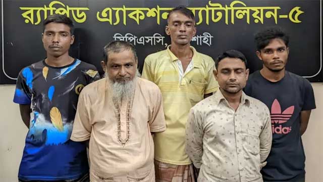 গ্রেফতারকৃতরা হলো—তানোর উপজেলার মাসিন্দা গ্রামের ময়েজ উদ্দিন (৭৩), তাঁর ছেলে মো. খোকন (৩৫), একই গ্রামের হাফিজুর (৩৫), রাইতান বড়শো গ্রামের ইসমাইল হোসেন (২৬) ও মো. ছারু খান (২৯)।