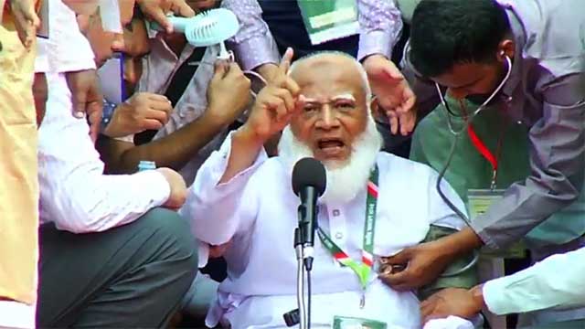 এরপর কয়েক সেকেন্ডের ব্যবধানে উঠে দাঁড়িয়ে তিনি দ্বিতীয় দফায় ফের পড়ে যান মঞ্চেই। এরপর তিনি আবারও উঠে বসেন এবং বসে বসেই নিজের বক্তব্য শেষ করেন। পড়ে পায়ে হেঁটেই মঞ্চ থেকে নেমে যান জামায়াত আমির।
