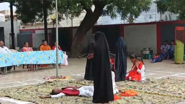 সংশ্লিষ্ট স্কুল কর্তৃপক্ষের বিরুদ্ধে ব্যবস্থা নেওয়ার দাবি জানিয়েছেন তারা। বিতর্কের কারণ ভাবনগর শহরের কুম্ভরওয়াড়া এলাকার যে স্কুলে ভারতের স্বাধীনতা দিবস উপলক্ষে অনুষ্ঠানের আয়োজন করা হয়েছিল, সেখানে সাদা পোশাক ও গেরুয়া ওড়না পরা ছাত্রীদের ওপর ‘সন্ত্রাসী’ সাজা ছাত্রীদের হামলা চালাতে দেখা যায়। যে ছাত্রীরা ওই নাটকে ‘সন্ত্রাসী’ সেজেছিল, তারা বোরকা পরে ছিল বলে অভিযোগ।