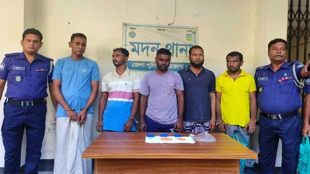 গ্রেপ্তাররা হলেন— উপজেলার কদমশ্রী মনিকা গ্রামের আবুল মিয়ার ছেলে মাহবুব (২৬), পরশখিলা গ্রামের ইসরাফিলের ছেলে হিরন মিয়া (২৭), তিয়শ্রী উত্তরপাড়ার কহোজ মিয়ার ছেলে মিলন শেখ (৩২), বৃ- বরিকান্দি গ্রামের ধনাই মিয়ার ছেলে আনোয়ার হোসেন আনু (২৮) ও মদন উত্তরপাড়া গ্রামের রুবেল মিয়া (২৮)।