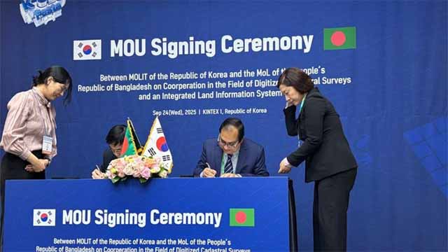 দেশে সমন্বিত ভূমি তথ্য ব্যবস্থাপনা সিস্টেম বাস্তবায়নে দক্ষিণ কোরিয়ার ভূমি, অবকাঠামো ও পরিবহন মন্ত্রণালয় এবং বাংলাদেশ সরকারের ভূমি মন্ত্রণালয়ের মধ্যে ডিজিটাইজড ক্যাডাস্ট্রাল সার্ভের মধ্যে একটি সমঝোতা স্মারক (MoU) স্বাক্ষরিত হয়েছে।