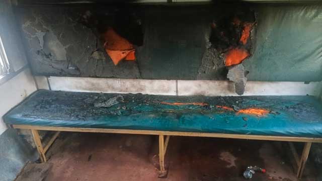 ময়মনসিংহ রেলওয়ে স্টেশনের ওয়াশপিটে দাঁড়িয়ে থাকা একটি লোকাল ট্রেনের বগিতে নাশকতার উদ্দেশ্যে আগুন দিয়েছে দুর্বৃত্তরা। বুধবার ভোর ৪টার দিকে রেলস্টেশনে এই অগ্নিসংযোগের ঘটনা ঘটে। তবে রেলওয়ে নিরাপত্তা বাহিনীর (আরএনবি) তিন সদস্যের তাৎক্ষণিক বুদ্ধিমত্তা ও সাহসী পদক্ষেপে বড় ধরনের ক্ষয়ক্ষতি এড়ানো সম্ভব হয়েছে।