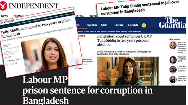 দ্য টেলিগ্রাফ লিখেছে, ‘Tulip Siddiq jailed for two years over corruption in Bangladesh’ (বাংলাদেশে দুর্নীতির অভিযোগে টিউলিপ সিদ্দিককে দুই বছরের কারাদণ্ড)।
